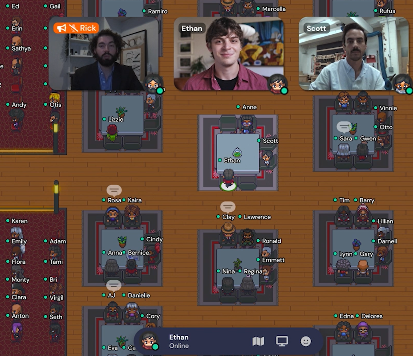 "Instead of it being the Zoom-style rooms you enter and leave, Gather feels so much more natural, with you wandering around the space and mingling between groups."